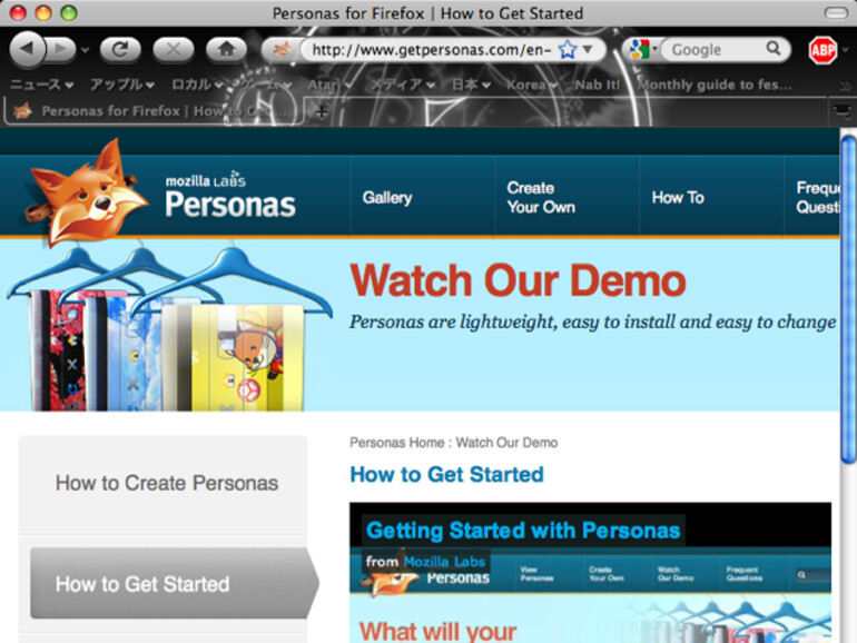 Getan wurde aber auch etwas an der Optik: Firefox unterstützt nun Personas, ohne Plug-ins installieren zu müssen. Personas sind einfache grafische Themen, die das Aussehen des oberen (Navigationsleiste, Tabs, Lesezeichenleiste) und unteren (Status) Bereichs ändern. Sie sind einfacher zu erstellen als die schon länger verfügbaren Themen, die auch das Aussehen von Schaltflächen und Menüs ändern.