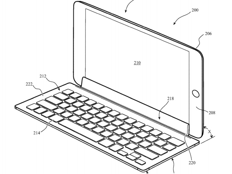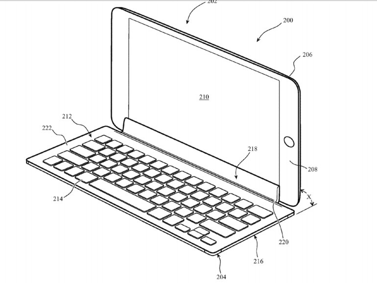 Das Patent beschreibt, wie Apple iPad und Tastatur mit Hilfe eines neuen Zubehörteils verbinden möchte. Eine Möglichkeit wäre, dies mit einer Art Schiebeklemme zu realisieren, in die man das iPad einsteckt. Dadurch werden die nötigen Kontakte zur Übertragung von Daten und Strom verbunden.