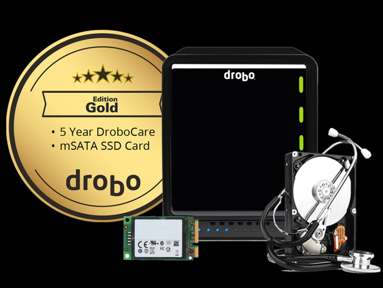 Endlich genug Speicher! Das Drobo 5D3 Direct Attached Storage Gold-Edition (769 Euro) hat bis zu 64 Terabyte Festplattenkapazität unter der Haube und dürfte damit selbst anspruchsvollen Kreativen oder Agenturen ausreichend digitalen Platz und Leistung bieten. Drobo verlangt vom Anwender kein Expertenwissen über RAID-Typen für einen reibungslosen Arbeitsablauf und lässt sich sehr intuitiv bedienen: Einfach anschließen, mit Festplatten bestücken und loslegen. Das spart dem Anwender kostbare Zeit und nimmt die Angst vor komplizierten Nutzungsprozessen. Bei Kapazitätsbedarf können dem Dobro in Echtzeit Laufwerke hinzugefügt oder diese ausgetauscht werden. Wie alle Drobos beinhaltet das 5D3-Modell einen integrierten Akku für Schutz bei Stromausfall und ist kompatibel zu Apples Time Machine. Mit zwei Thunderbolt 3 Steckplätzen für Daisy-Chaining von bis zu sechs Geräten und einem USB 3.0 Typ-C- Anschluss sind Sie flexibel in der Anbindung. Die Gold-Edition beinhaltet zusätzlich fünf Jahre DroboCare-Garantie mit Hardware-Ersatz und Rundumbetreuung sowie eine 128GB mSATA SSD für Data-Chaching.