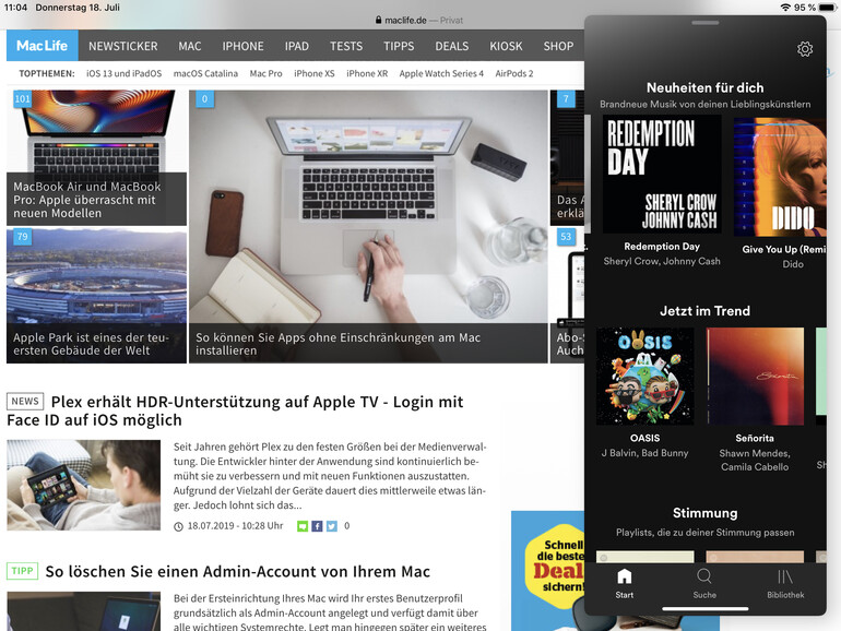 Fast noch besser ist allerdings das vielmals unterschätze Slide-Over-Feature. Hier ziehen Sie die App einfach aus dem Dock einfach über eine andere App. Dabei öffnet sich eine verkleinerte überlagernde Ansicht, die sich mit einem Wisch wieder entfernen lässt. Wischen Sie wieder vom rechten Rand zur Bildschirmmitte erscheint die App wieder. Dies ist sehr praktisch und verkleinert dabei den Arbeitsbereich nicht.
