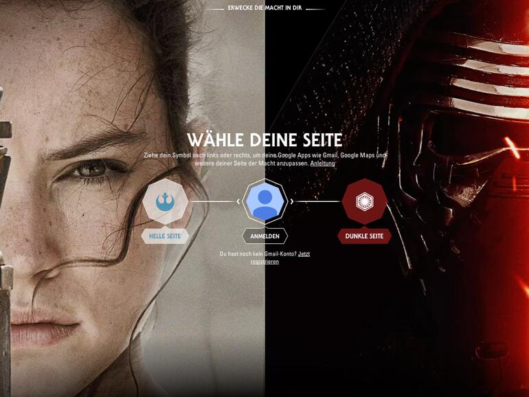 „Wenn du dich für eine Seite entscheidest, veränderst du damit deine Nutzererfahrung mit Chromecast, Gmail, Google Maps und weiteren Diensten. Diese Entscheidung wirkt sich nicht auf die Funktionalität dieser Produkte aus.“ - Die FAQ zur Aktion „Erwecke die Macht in Dir“ macht direkt klar, dass es sich um rein kosmetische Veränderungen der Anwendungen handelt. An dem Star-Wars-Event beteiligt sind folgende Apps: Android Wear, Chrome, Chromecast, Gmail, Inbox by Gmail, Google Kalender, Google Maps, Google Now, Google-Suche, Google Übersetzer, Waze und YouTube.