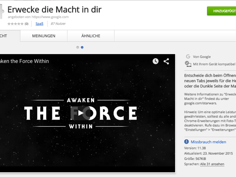 Es kann einige Stunden dauern, bis die Änderungen auf alle verfügbaren Anwendungen übergegriffen haben. Für den Browser Google Chrome gibt es eine Gratis-Erweiterung, die neue Fenster und Reiter mit einem schicken Standbild aus Star War VII öffnet, Google Maps unter iOS lässt einen Sternzerstörer über der Heimadresse einschweben (Dunkle Seite), und bei YouTube wird der Fortschrittsbalken zum Lichtschwert mit Soundeffekten.
