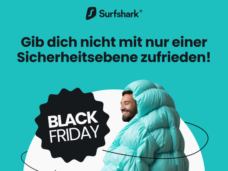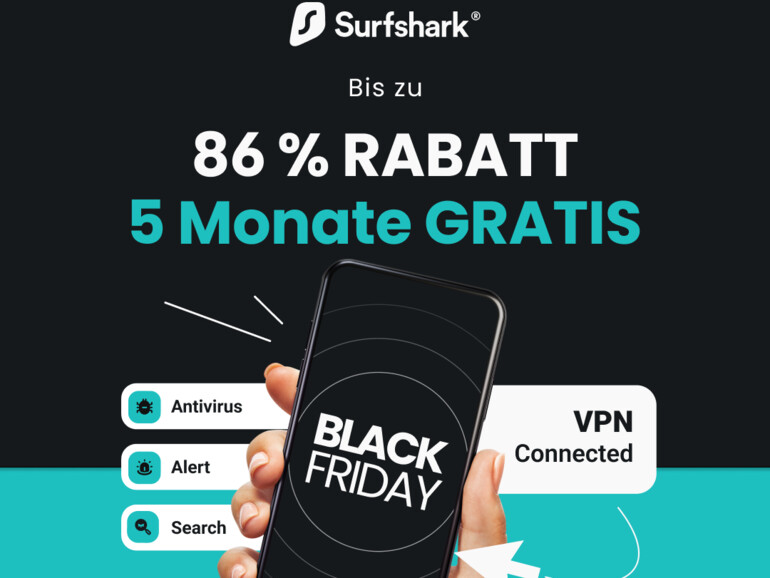 Mit dem BlackFriday-Deal erhältst du den Surfshark-VPN mit bis zu 86% Rabatt und bis zu fünf Monate gratis. Bei einem Abschluss über zwei Jahre heißt das: Beim Starter-Angebot (1,99 Euro monatlich, 53,73 Euro für 27 Monate) bekommst du drei Monate gratis, bei dem Angebot One (2,69 Euro monatlich, 75,32 Euro für 28 Monate) vier Monate und bei dem One+ (3,99 Euro monatlich, 115,71 Euro für 29 Monate) sogar fünf kostenlose Monate Surfshark. Zudem gibt es eine dreißigtägige Geld-zurück-Garantie.