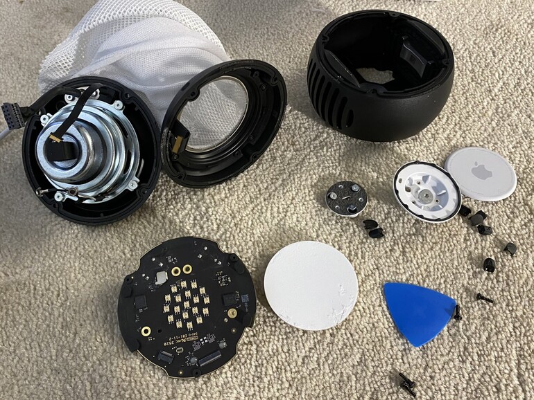 Der Teardown von ouimetnick wurde „im Forum von MacRumors in Form von Fotos veröffentlicht. Schon zu Beginn des Teardowns wird klar, dass der der HomePod sich nicht beschädigungsfrei öffnen lässt. Grund ist die Stoffbespannung. Wer die obere Touch-Oberfläche zuerst öffnet, beschädigt das Gerät irreparabel.