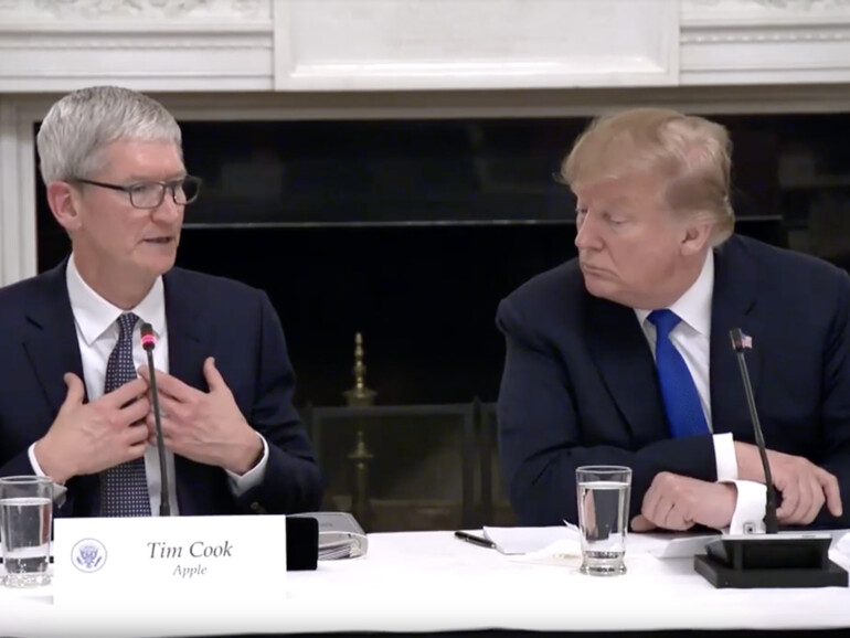 Donald Trump bedankte sich kurz und kam später nochmal auf Cook zurück. Dabei lobte er nicht nur die großen Investitionen seitens Apple, um Produkte in den USA zu produzieren, sondern gleichzeitig nannte er ihn auch „Tim Apple“. Ohne größere Pause zwischen beiden Wörtern und ließ es wie einen Namen klingen. Im Transkript fügten die zuständigen Personen jedenfalls eine Pause ein.