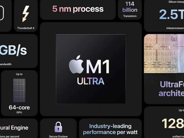 Der M1 Ultra kommt mit 20 CPU-Kernen (16 davon High-Performance-Cores und 4 High-Efficiency-Cores), gepaart mit einer Grafikeinheit mit nicht weniger als 64 Rechenkernen sowie einer 32-Core Neural Engine für KI-Aufgaben, die bis zu 22 Billionen Rechenoperationen pro Sekunde ausführt. Dabei unterstützt der M1 Ultra 64 oder 128 Gigabyte geteilten RAM. Alternativ ist eine Variante mit „nur“ 48 CPU-Kernen zu haben.