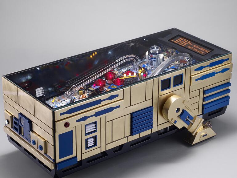 Wer schon einmal im heimischen Wohnzimmer Maß nehmen möchte: 54 Zentimeter hoch, 147 Zentimeter lang und 71,5 Zentimeter breit soll das gute Stück in seiner Gänze sein und 50 Kilogramm wiegen. Für den Star Wars Fan empfiehlt sich bei Altar Furniture übrigens aus der gleichen Bauserie der Flipper-Couchtisch „R2PO“, dessen Herzstück wiederum ein Gerät von Data East von 1991 ist. Mit 14456 Euro ist der Kaufpreis allerdings deutlich höher angesetzt.