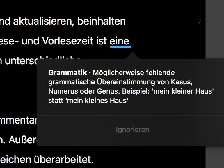 Ulysses 20 führt das Dashboard ein - eine Seitenleiste, über die du Statistiken sehen, navigieren, Kommentare verwalten und dir einen Überblick über Mediendateien verschaffen kannst. Außerdem ist darin eine sehr leistungsfähige Stil- und Grammatik-Prüfung eingebaut worden. Diese funktioniert auch mit der deutschen Sprache nach einem Kurztest von Mac Life sehr gut.