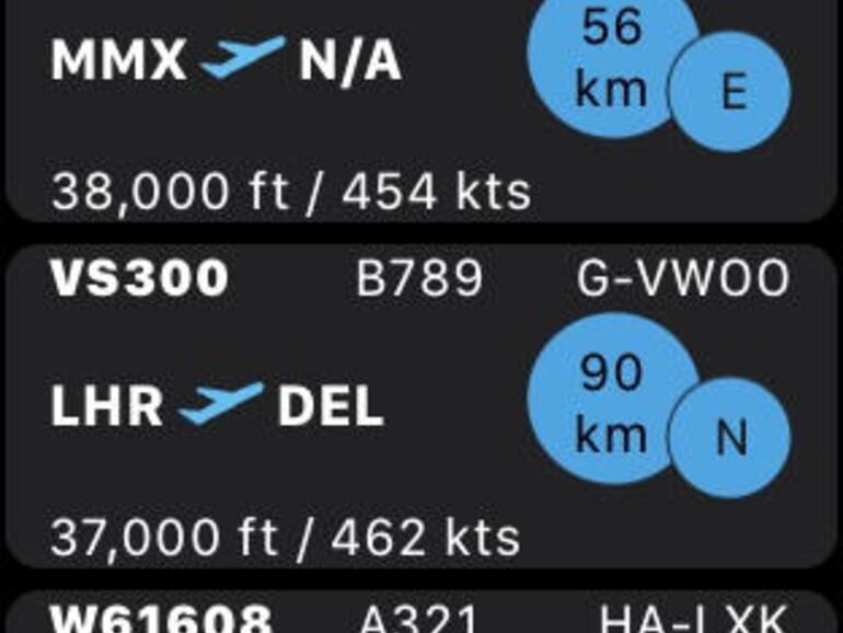 Die iPhone-Version von Flightradar24 ist Augmented Reality in Reinkultur: Man hält die Kamera in den Himmel und sieht genau, welcher Flieger gerade Kondensstreifen zieht und wohin er unterwegs ist. Das ist natürlich ein etwas offensives Vorgehen, die Watch-App dagegen zeigt nur eine Liste der Flüge in der Nähe mit der Himmelsrichtung, in die sie fliegen. Außerdem lässt sich der Flug auf der Karte zeigen.