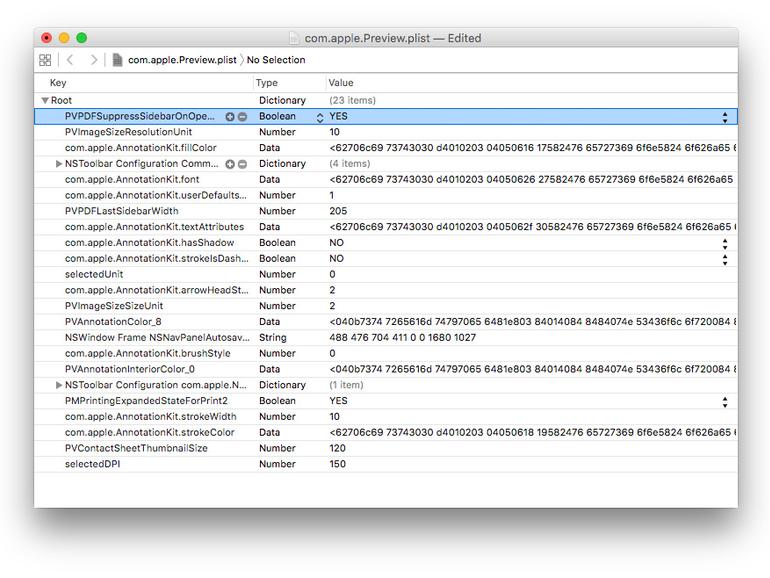 defaults write com.apple.Preview PVPDFSuppressSidebarOnOpening true