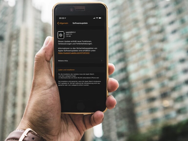Um das Update zu installieren, muss die Apple Watch zu mindestens 50 Prozent geladen sein, auf dem Ladegerät liegen und sich in Reichweite des gekoppelten iPhones befinden.