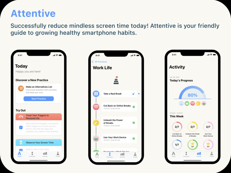 Attentive ist eine App, welche sich zu Nutze macht, dass Smartphone-Nutzer häufig konzentriert auf ihr Smartphone schauen. In kurzen Übungen lernen Nutzer:innen, wie sie gesunde Smartphone-Gewohnheiten entwickeln, sich nicht so leicht vom Smartphone ablenken lassen und eine gesunde Online/Offline-Balance finden. Insgesamt sechzehn Übungen in drei Kategorien stehen zur Auswahl, weitere kommen hinzu.