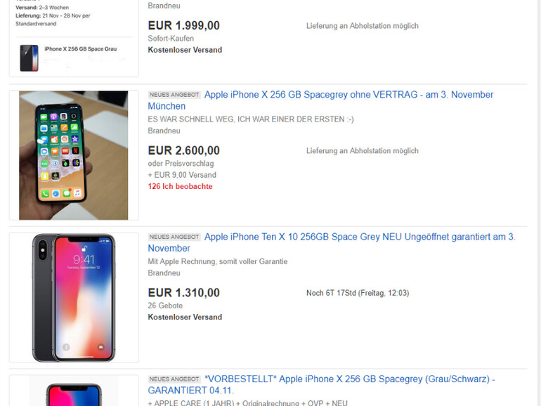 Einige Geschäftemacher verhökern die Geräte auf eBay zu Traumpreisen, doch wir konnten beobachten, dass es auch Käufer gibt, die bereit sind, für ein iPhone X mit 256 GByte Speicher 2.600 oder sogar 2.700 Euro auszugeben. Sie werden, sofern sie nicht an einen Betrüger geraten sind, ihr Wunsch-Smartphone dann schon am 4. November oder am Folgetag in Händen halten, denn es muss schließlich noch vom Erstkäufer weiter geschickt werden.