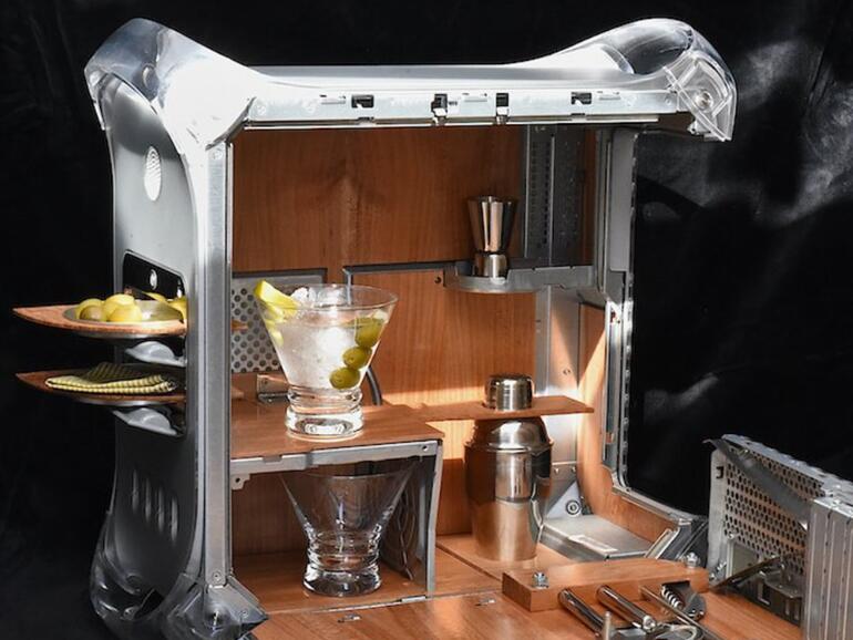 Als Burde den Power Mac G4 sah, durchströmten ihn die Ideen (via Cult of Mac) und er verwandelte den alten Mac kurzerhand in eine klappbare Cocktailbar. Zusammengeklappt ist er vom ursprünglichen Modell kaum zu unterscheiden und geöffnet bietet er Köstlichkeiten.