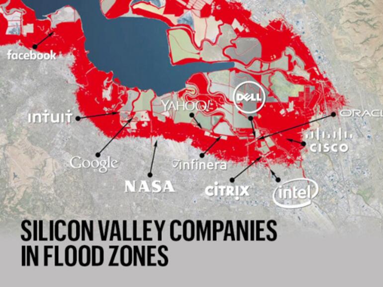 Googles Hauptquartier, der sogenannte Googleplex, befindet sich neben einem Golfplatz direkt an der Küste, und die Gebäude von Facebook liegen quasi inmitten einer Schlammkuhle. Und welches Phänomen ist ob starker Niederschläge jetzt bereits weiter südlich in Los Angeles zu beobachten? Schlammlawinen. Der Bericht geht leider nicht darauf ein, welche Vorkehrungen gegen Überflutung die High-Tech-Konzerne für ihre Zentralen getroffen haben.