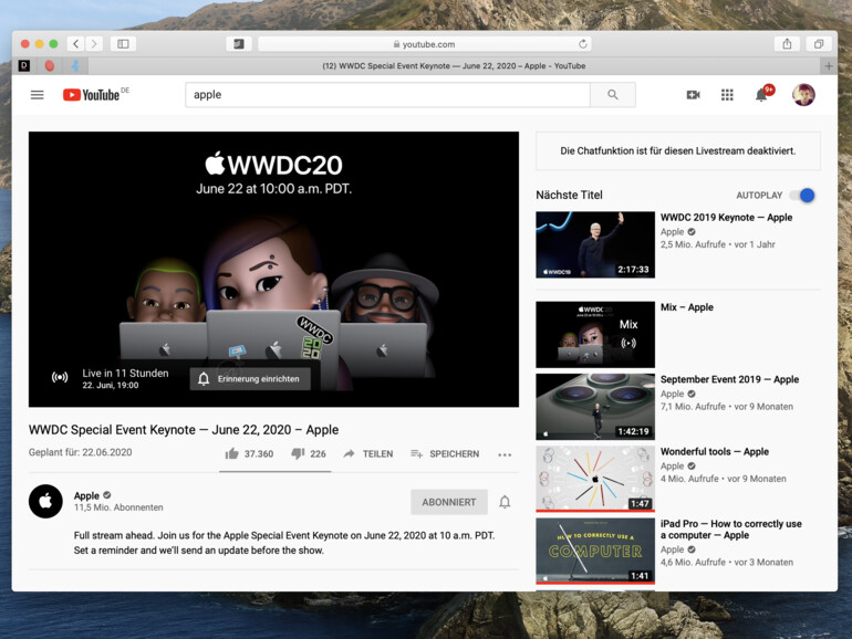 Wenn du hingegen nicht auf einem Apple-Gerät mit Safari oder der TV-App die Keynote anschauen willst, dann hast du auch die Möglichkeit die WWDC 2020 auf YouTube live zu verfolgen. Dadurch kannst du sie auf allen Geräten mit YouTube-App sehen – auch auf deinem Smart TV. Die zugehörige Seite hat Apple bereits hier eingerichtet und erlaubt dir sogar einen Alarm einzurichten, damit du das Event nicht verpasst.