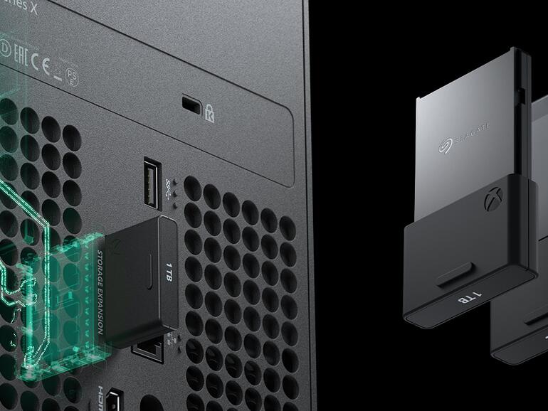 Bei den SSDs haben sich die Konkurrenten für eigene Lösungen auf Basis der neuen PCIe-4.0-Schnittstelle entschieden. Microsoft legte die Latte mit 1 TB internem Speicher hoch, macht diesen aber nicht austauschbar. Vielmehr setzt man auf ein proprietäres Speichermedium, das in Kooperation mit Seagate entstanden ist. Der Erweiterungsstick lässt sich einfach an der Rückseite einstecken wie eine Memory Card und verfügt zudem über eine integrierte Kühlung. Laut Microsoft will man dadurch ein Überhitzen durch den hohen Datendurchsatz von 2,4 GB/s (Raw) vermeiden.