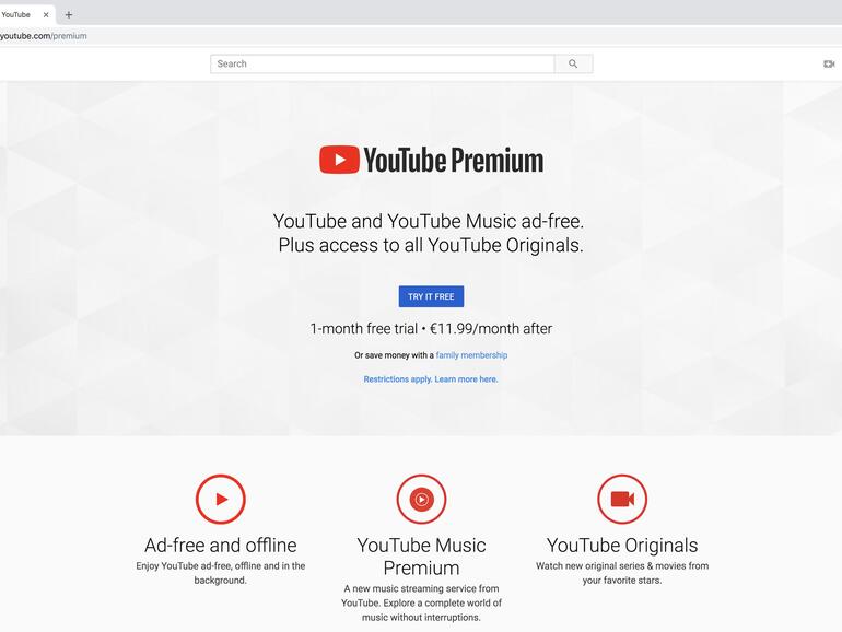 Im ersten Schritt besuchen Sie youtube.com/premium. Die Übersichtsseite fasst alle Vorteile des kostenpflichtigen Abos zusammen. Der erste Monat ist kostenlos, danach kostet das Abo 11,99 Euro pro Monat.