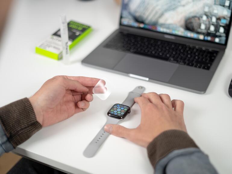 - vollflächige Schutzfolie für das Apple-Watch-Display, speziell für gebogene Smartwatch-Displays entwickelt