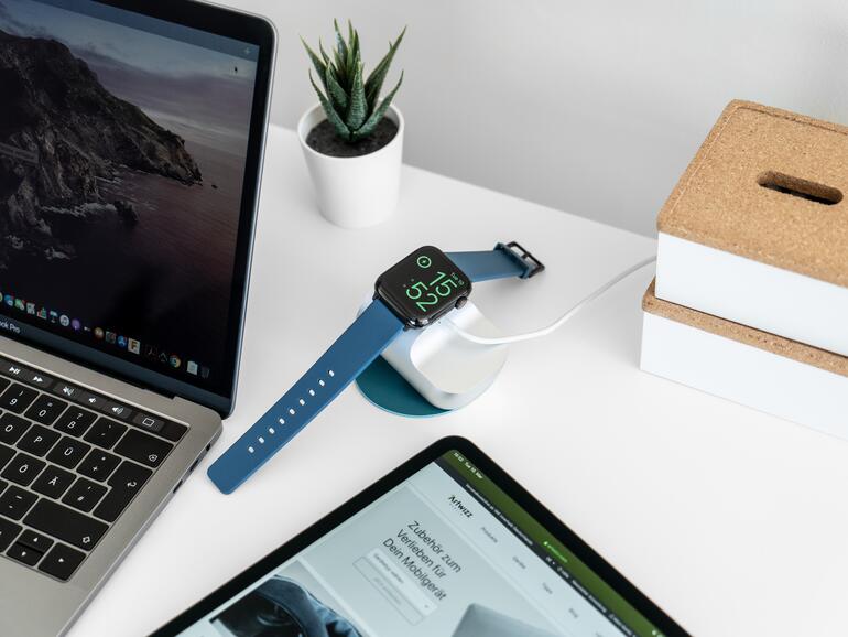 - Apple Watch kann geschlossen oder offen aufgesetzt und geladen werden, integrierter Magnet zur Fixierung des Ladekabels am Stand