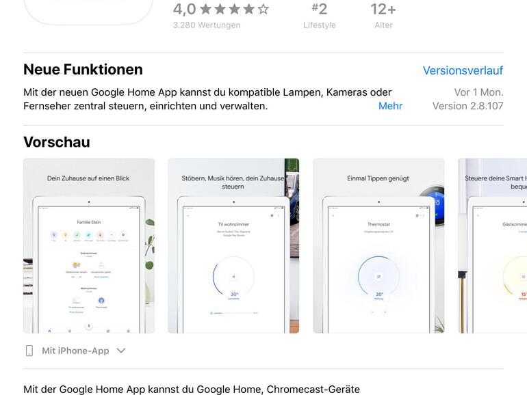 Ihr Google-Home-Lautsprecher fügt sich in die gleichnamige App ein, die für iPhone und iPad im App Store wartet. Wenn noch nicht geschehen, installieren Sie diese und lassen Sie sich durch die Geräteeinrichtung führen.