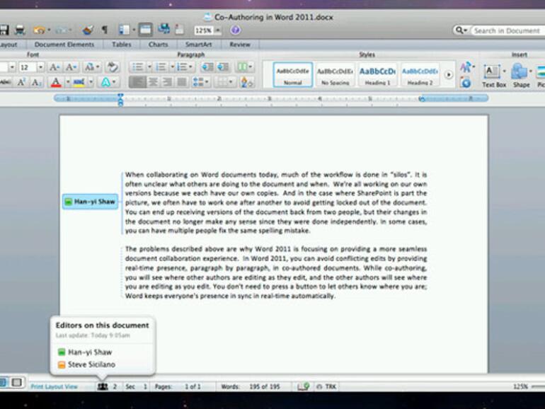 Ähnlich wie bei Google Docs soll Office for Mac 2011 eine Möglichkeit bieten, Dokumente zeit- und ortsunabhängig zu bearbeiten. Sind Dokumente auf Microsoft SkyDrive gespeichert, können mehrere Personen gleichzeitig an einem Dokument werkeln. Für Unternehmen, die mit diesem gemeinschaftlichen Funktionen arbeiten möchten, wird auch einen Unterstützung für Microsoft SharePoint implementiert.