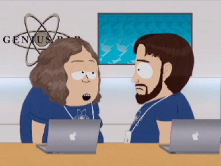 Gänzlich auf Apple eingeschossen ist die erste Folge der 15. Staffel von Southpark, der umstrittenen Zeichentrickserie von Matt Stone und Trey Parker. Wenig geniale Apple Geniuses, der Markenzwang bei der Tablet-PC-Auswahl im Elektronik-Markt und nicht zuletzt die revolutionären Produkt-Ideen des Steve Jobs kriegen ihr satirisches Fett weg.