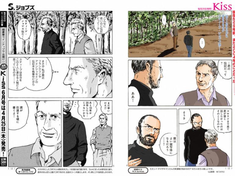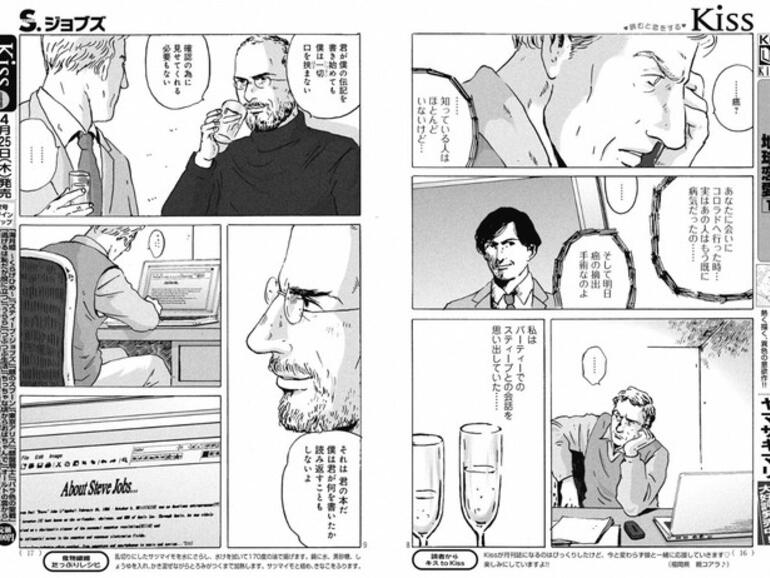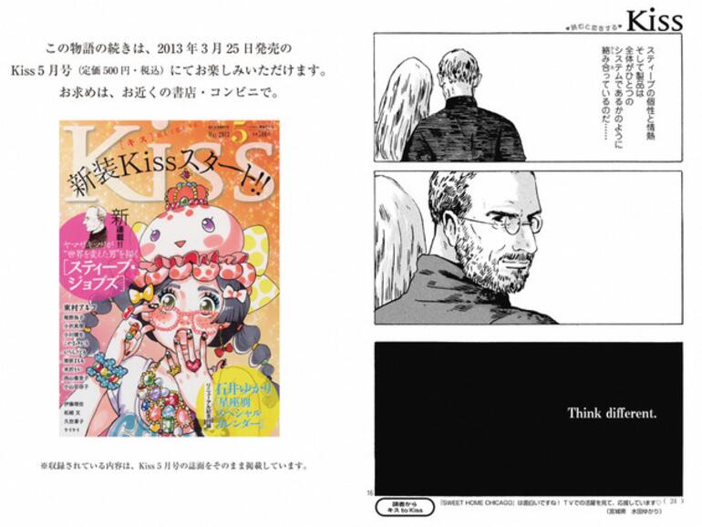 Die preisgekrönten Manga-Autoren Manga Taishō und Tezuka Osamu starten ihre Manga-Biographie von Apple-Mitbegründer Steve Jobs in der April-Ausgabe des japanischen Magazins „Kiss“, das diese Woche in Japan in den Handel kommt. Ein paar Seiten aus dem ersten Kapitel wurden vorab gezeigt. Das Monatsmagazin „Kiss“ ist eine so genannte Joshei Manga Serie, die sich hauptsächlich an junge Frauen als Zielgruppe richtet.