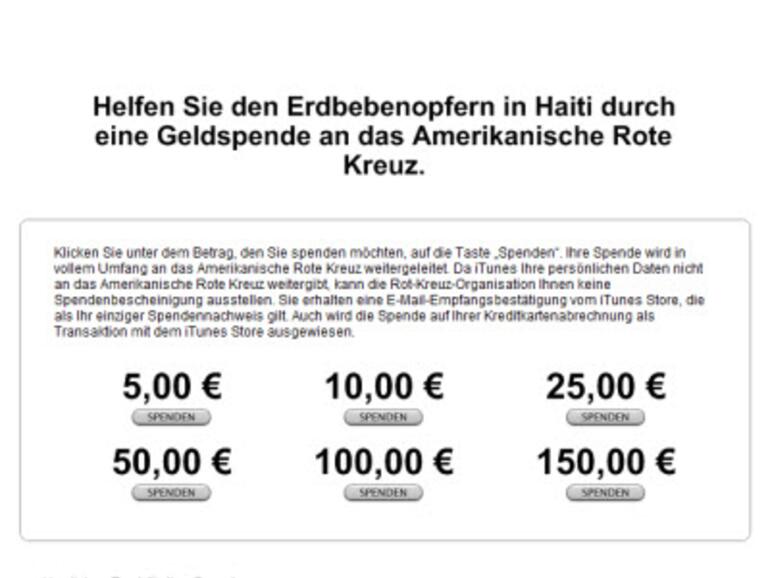 Zu diesem Zweck hat Apple in iTunes eine Spendenmöglichkeit eingerichtet, ganz einfach über das iTunes-Konto. Hilfsbereite haben die Wahl zwischen fünf, zehn, 25, 50 100 oder gar 150 Euro. Mit der Spende unterstützen Sie die internationale Föderation der Rotkreuz- und Rothalbmond-Gesellschaften.