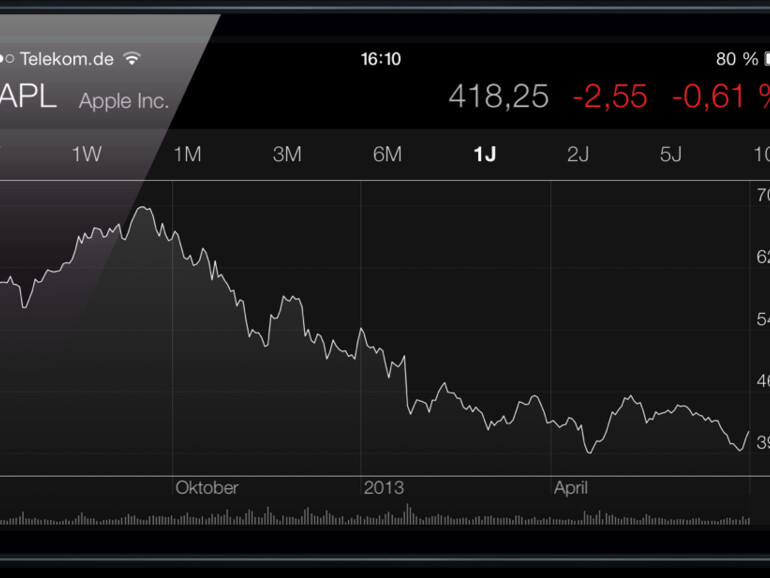 Schnellvorlauf Sommer 2013: Bei 388 Dollar notierte die Apple-Aktie am vorigen Freitag im Intraday-Handel, ehe Schnäppchenjäger diese Woche zugriffen und wieder für steigende Kurse über der 400-Dollarmarke sorgten. Von 705 Dollar auf 388 bzw. im April sogar 385 Dollar: Auch wenn Apple im Zuge der Finanzkrise 2008 prozentual noch stärker an Wert verlor, ist der Absturz absolut historisch.
