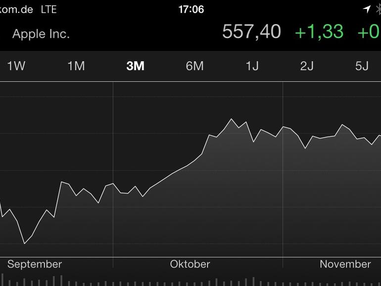 14 Monate später ist Apple exakt 500 Milliarden Dollar wert. Was nach einem harschen Abstieg klingt, dürfte Aktionäre doch in Hochstimmung versetzen. Vor fünf Monaten nämlich war Apple keine 370 Milliarden Dollar mehr wert. So dramatisch war der Börsenabsturz tatsächlich:  Fast 300 Milliarden Dollar lösten sich in Luft auf, als Apple bis auf  buchstäblich 385 Dollar abstürzte.