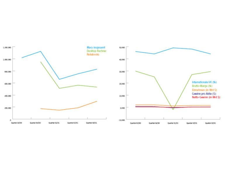 Im Juli 2001 deutet nichts auf die bevorstehende Katastrophe hin. Nur der Rückruf von 570.000 Netzteilen der 1998 bis 2000 hergestellten Notebooks in Asien und USA warf einen kleinen Schatten auf Apple. Als das Unternehmen am 18. Juli 2001 aber seine Geschäftszahlen für das abgelaufene dritte Quartal vorlegte, war dieser verfl ogen: Die Analysten hatten einen Gewinn von gerade einmal 0,05 US-Dollar pro Aktie erwartet – immerhin war Apple nur ein halbes Jahr zuvor tief in die Krise gerutscht. Tatsächlich aber konnten 0,17 US-Dollar pro Aktie und damit ein Gewinn von 61 Millionen US-Dollar erwirtschaftet werden. Deutliche Verkaufsanstiege der Notebook- und Desktop-Rechner seit Weihnachten des Vorjahres zeigten, dass Apples Strategie der neuen Rechnermodelle, wie iBook und PowerBook, aufging – die Kundschaft vertraute auf die neuen tragbaren Macs und Apple. Zusätzlich trug das Engagement im Erziehungssektor erste Früchte, wie Steve Jobs stolz hervorhob: „Wir hatten ein ausgezeichnetes Quartal im Erziehungsbereich und ein ausgezeichnetes Quartal für das iBook. Wir haben insgesamt 182.000 unserer neuen, sehr populären Notebooks für Endverbraucher und in den Schulbereich verkauft.“ Apple war nach Erhebungen des Marktforschungsunternehmens Quality Education Data (QED) wieder zur Nummer eins des US-Schulmarkts geworden und hatte Dell damit die vorübergehende Spitzenposition entrissen.