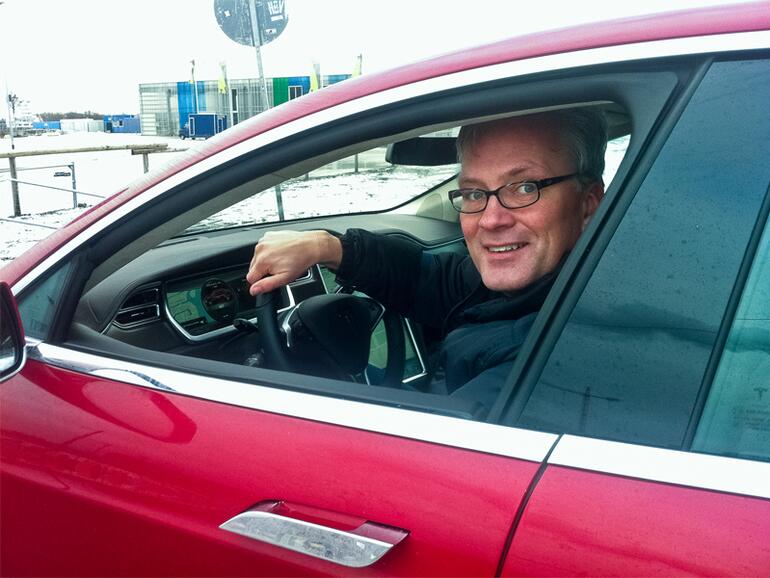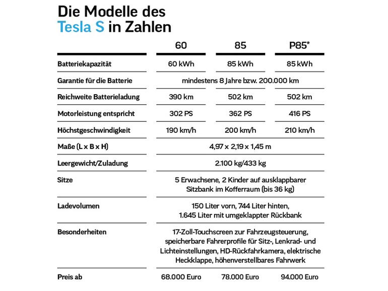 Nach dem zweisitzigen Roadster ist die Oberklassen-Limousine das zweite Modell des kalifornischen Autoherstellers, der nach dem Physiker Nikola Tesla benannt wurde. Im Heck arbeitet ein elektrischer Motor mit 600 Newtonmeter Drehmoment und bis zu 16.000 Umdrehungen pro Minute. Noch sagen mir diese Werte nichts, also genieße ich das lautlose Dahingleiten. Außer den Rollgeräuschen der Reifen ist nichts zu hören. Mein iPhone ist per Bluetooth mit der Bordelektronik verbunden. Am Lenkradknopf scrolle ich durch mein Telefonbuch, um meine technikbegeisterten Freunde zu einer Probefahrt einzuladen. In den vier Testtagen nehmen etliche Leute auf dem Beifahrersitz Platz, und die meistgestellte Frage lautet: „Warum bekommen die Amerikaner so ein Elektroauto hin und die deutschen Autobauer nicht?“ Gemeint ist in erster Linie die Reichweite. Während die etablierten Hersteller Elektroautos mit Reichweiten zwischen 150 und 200 Kilometer auf dem Markt haben, zeigt mein Fahrerdisplay nach dem ersten Ladestopp: 506 km. Gut, das schaffe ich an diesem stürmischen Winterwochenende mit eingeschalteter Sitzheizung und Gebläse nicht, aber etwas über 400 km sind drin.