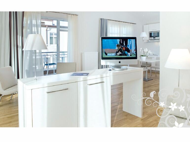 In den Zimmern selbst steht den Gästen das komplette Multimedia-Angebot des iMacs zur Verfügung. Nicht nur kann dieser als Fernseher, Radio und DVD-Player genutzt werden. Der Highspeed- Internetzugang erleichtert die gewohnte E-Mail-Kommunikation und verabreicht auf Wunsch auch im Urlaub die gewohnte Online-Dosis. Gäste des nymphe-Hotels zeigten sich vor allem von der bereitstehenden Film- und Fotosoftware begeistert – eben geschossene Bilder können so noch am selben Tag an Familie und Freunde per E-Mail geschickt oder im Internet präsentiert werden. Dabei spricht der iMac nicht nur eingefl eischte Apple-Nutzer an, denn die vom Softwarehersteller Omnilab entwickelte Benutzeroberfl äche setzt auf fehlertolerante und intuitive Bedienung und macht alle relevanten Anwendungen per Mausklick erreichbar. Erfahrene Nutzer können daneben jederzeit auch direkt in Mac OS X arbeiten.