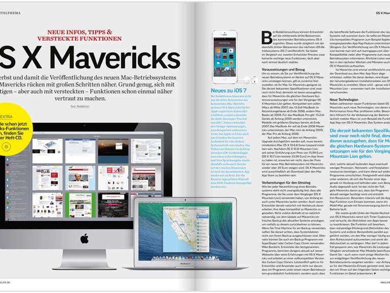 Auf 8 Seiten decken wir die versteckten Funktionen des kommenden Mac-Betriebssystems OS X Mavericks auf. Außerdem bieten wir alle Infos und Tipps zum neuen Finder, iCloud-Schlüsselbund, sowie iOS 7.