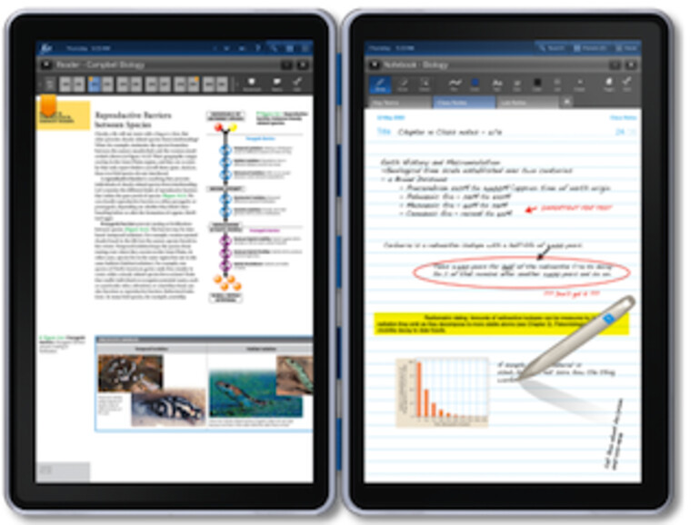 Die Verwirklichung des Microsoft-Courier-Projekts in Groß bietet aber außer der Displaygröße wenig Überraschungen: Die Bedienung erfolgt über einen Stift und der eingebaute Webbrowser unterstützt das von Bildungs-Webseiten gerne verwendete Flash. Über das verwendete Betriebssystem schweigt sich der Hersteller aus, wirbt aber bereits um Entwickler, die auf Basis von Webstandards entwickeln sollen. Jedes Display wird mit einem eigenen Akku versorgt.