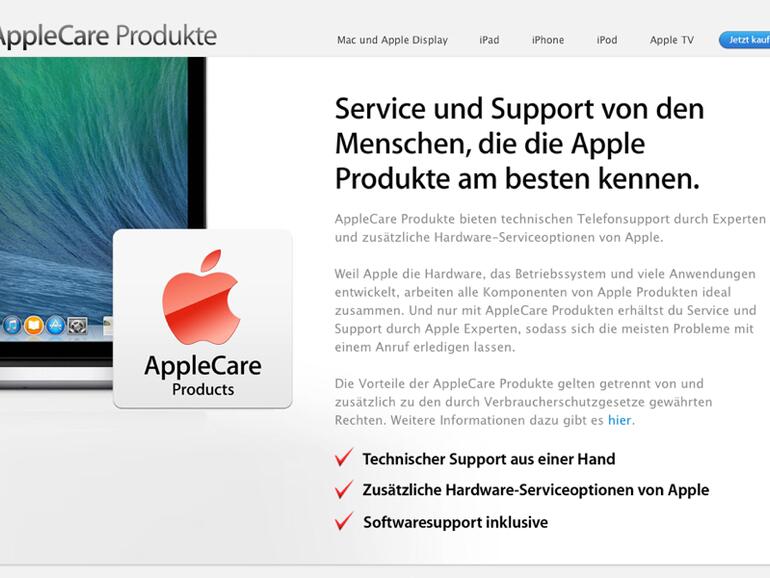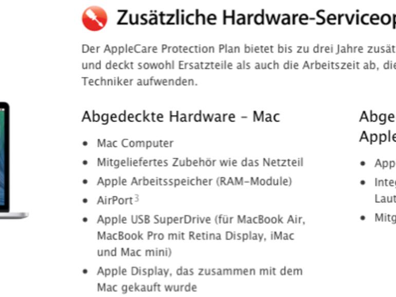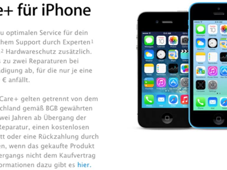 Die Dienstleistung Apple Care+, für die Apple bisher in 14 Ländern schon 30 Millionen Kunden gewinnen konnte, bietet Anwendern von iPod, iPhone und iPad zwei Jahre lang Hard- und Software-Support und tritt zusätzlich als Versicherung bei bis zu zwei unabsichtlichen Beschädigungen der Geräte ein. Künftig soll Apple Care+ binnen 60 statt bisher 30 Tagen nach Kauf abzuschließen sein, in weiteren Ländern, direkt über iTunes und so irgend möglich sogar für den Mac angeboten werden.