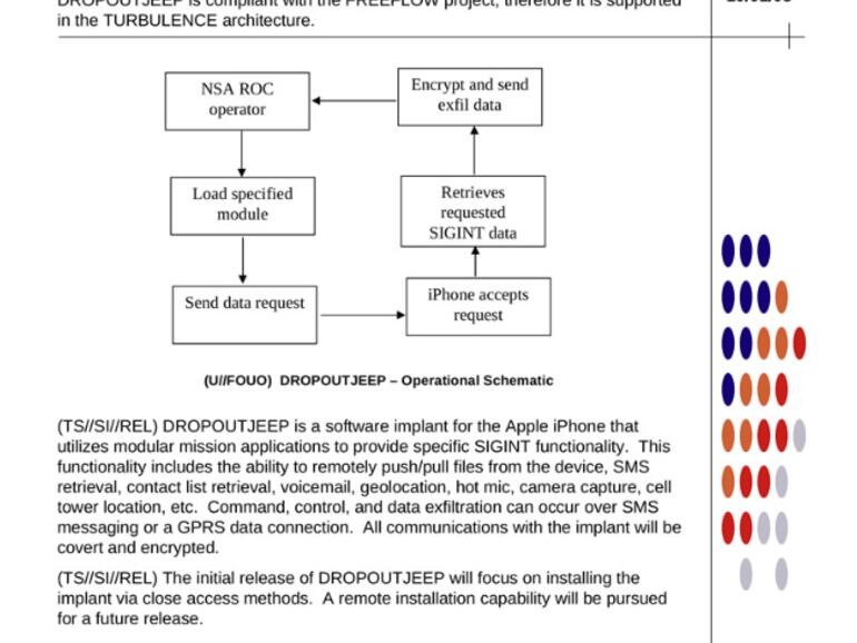 Zum Jahresende 2013 reagiert Apple auf erneute Vorwürfe, der US-amerikanischen National Security Agency bereitwillig in die Hände zu spielen oder deren Manipulation von iPhones oder anderen Apple-Produkten zumindest zu billigen. Aufsehen erregt hatte die Veröffentlichung des angeblichen Geheimdokuments über „DROPOUTJEEP“, ein von der NSA geplantes Software-Implantat für das damalige iPhone OS.