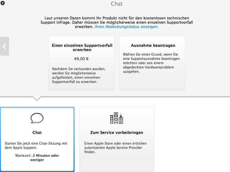 Damit sei es ab dem März 2014 vorbei, wie es aus mit dem Projekt vertrauten Quellen heißt. Auf eine Basis mit dem Telefon-Support gestellt, sei auch der Chat-Support künftig nur bei gültigem AppleCare-Schutz kostenlos. Um den Kunden „einen einzelnen Supportvorfall erwerben“ zu lassen, soll Apple seit dem August ein neues Zahlungsportal eingerichtet haben, das dieser Tage seinen Dienst aufnehmen werde.
