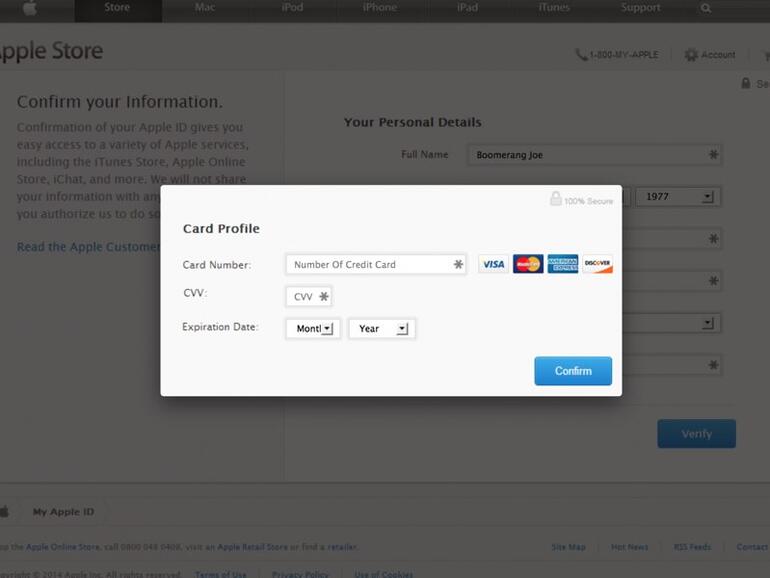 Wer darauf reingefallen ist, der wird aufgefordert, persönliche Daten einzugeben, also Name, Geburtstag, Rechnungsadresse und Telefon. Schließlich wird nach den Kreditkarteninformationen gefragt. Hat der Nutzer auch diese eingegeben, wird er auf die reale Apple-Webseite umgeleitet.