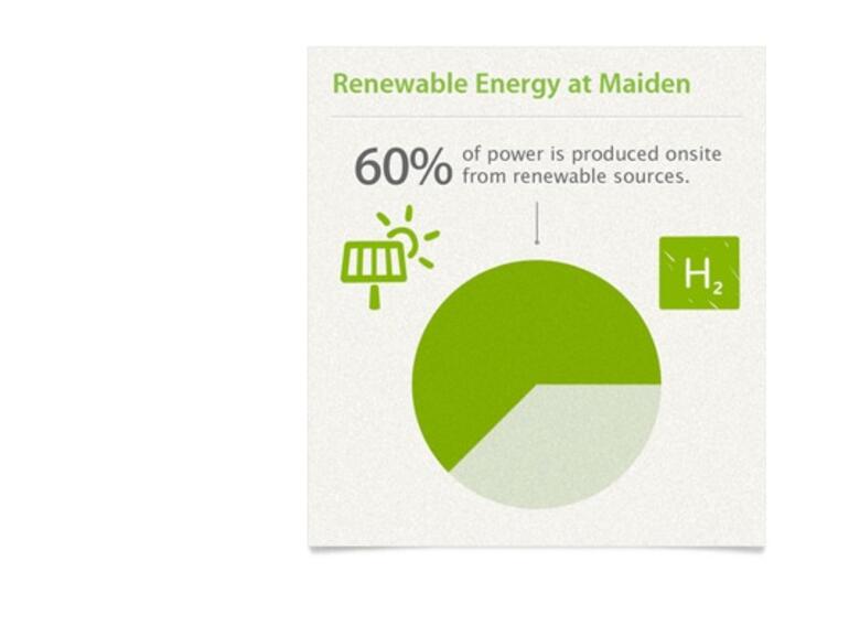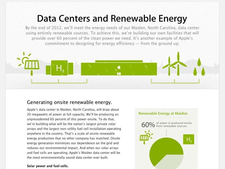 Auf der neuen Unterseite bei Apple.com heißt es dazu jetzt, Apple werde für das Datencenter in Maiden etwa 60 Prozent der Energie selbst produzieren. Die Baugenehmigung für eine Solarfarm mit 20 Megawatt Leistung wurde bereits erteilt, weitere, darunter auch eine Biogasanlage, befindet sich in der Planungsphase. Ziel sei die Verwendung von 100 Prozent erneuerbare Energien, auch für die Center in Newark und Prineville. Beim Zukauf von Energie soll ebenfalls nur auf Strom aus erneuerbaren Quellen zurück gegriffen werden.