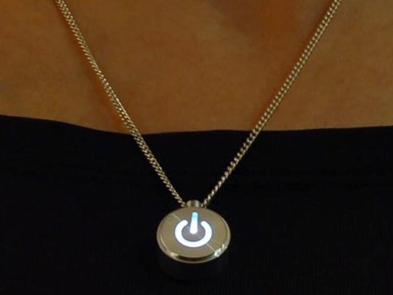 Das iNecklace ist aus Aluminium gefertigt und ähnelt dem Einschaltknopf der Macs und anderen Geräten. Im Gehäuse hat eine Batterie Platz, die Kette ist aus Silber. Mit einer Batterie kann das iNecklace bis zu 72 Stunden leuchten. Umgerechnet 60 Euro kostet das Schmuckstück.
