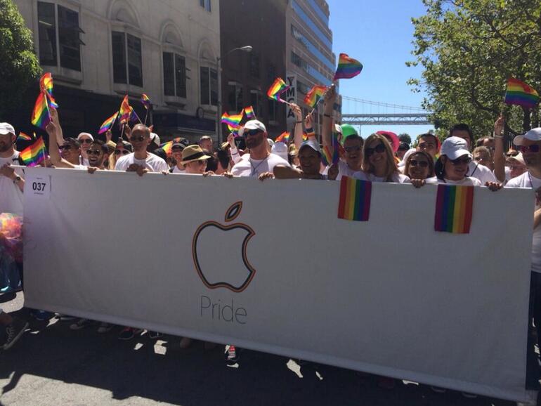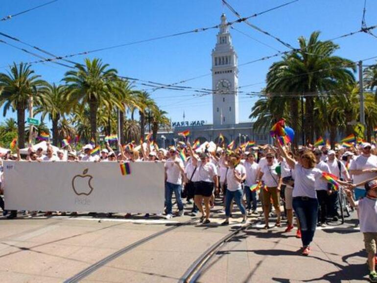 Lesben, Schwule, Bisexuelle und Transgender-Personen zogen gestern durch die Straßen San Franciscos und überfluteten Social Media wie Twitter und Instagram mit Selfies, Schnappschüssen und Bekundungen der Freude und des Stolzes. Die als Vizepräsidentin für Umweltfragen neu zu Apple dazugestoßene Lisa Jackson tweetete, sie fühle sich geehrt, als Banner-Trägerin für Apples Beitrag zur Parade auftreten zu dürfen.