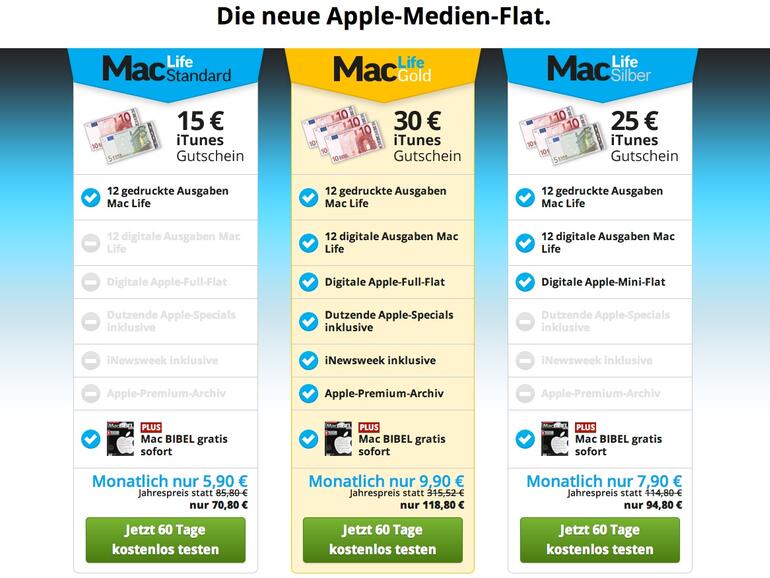 Die Flatrate nennt sich Mac Life Gold. Für 9,95 im Monat bekommt man jeden Monat die neuste gedruckte Ausgabe der Mac Life bequem in den Briefkasten. Für die Nutzung auf iPhone und iPad gibt es dazu dann eine Medien-Flatrate mit allen im Verlag verfügbaren Apple-Zeitschriften, inklusive Sonderpublikationen und Wissens-Specials. Ab 2014 gibt es dazu die neue, vierzehntägig-erscheinende digitale Apple-Zeitung iNewsweek.