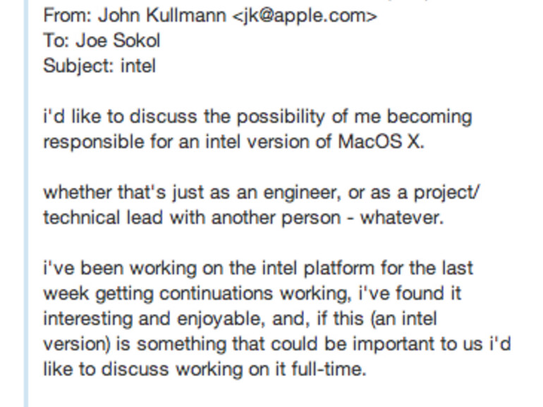 Acht Monate später, Kullmann hatte bereits drei PC mit Mac OS in seinem Büro laufen, wollte Sokol Fortschritte sehen. Was er dann zu sehen bekam, war ein Intel PC, der ganz selbstverständlich das Mac OS bootete. Sofort holte er Bertrand Serlet (Projektverantwortlicher Entwickler bei Apple, später Senior Vice President Mac Software Engineering) hinzu. Serlet bat um eine weitere Kostprobe. Er wollte wissen, wie lang Kullmann benötigen würde, um das Mac Betriebssystem auf einem Sony Vaio zum laufen zu bringen. „Zwei Wochen, drei Wochen?“ fragte er. Kullmanns Antwort war zwei Stunden - im Höchstfall drei.