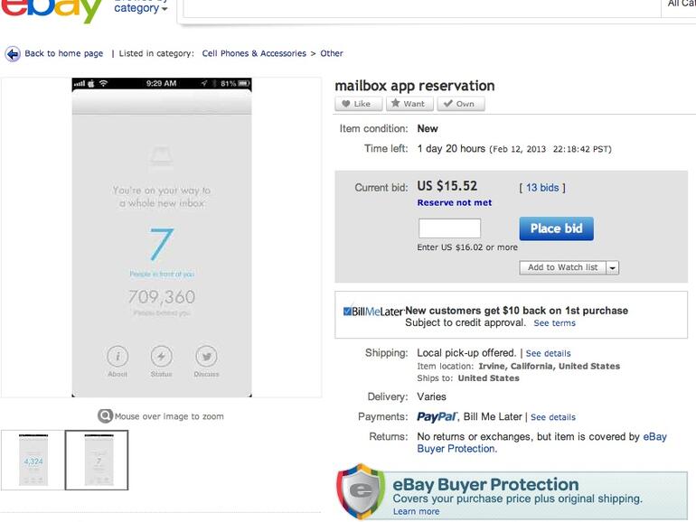 Aktuell ist ein Platz ganz vorn in der Reihe der Wartenden noch günstig zu haben: Bei eBay gibt es jetzt zum Beispiel ein Angebot sich einen vorderen Reservierungs-Platz für die iPhone-App Mailbox zu ersteigern. Die Aktion steht aktuell bei rund 15 US-Dollar.