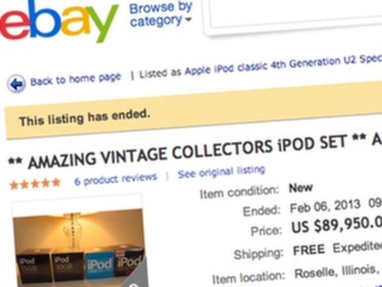 Es gibt aber auch noch ein paar Schnäppchen für Sammler. So steht eine Auktion mit Startpreis von 599 US-Dollar für eine von Steve Wozniak unterschriebene Mac-Schaltkreis-Zeichnung online sowie ein Spezial-Merchandise-Set von HP mit einem iPod Classic für 1.499 US-Dollar. Dazu bietet der eBay-Händler noch einige U2-iPods, Original-iPhones und iPod shuffles der ersten Generation.