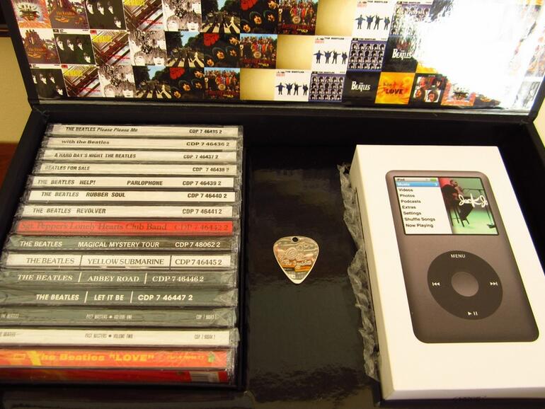 Das Set kommt mit einem iPod Classic der siebten Generation in schwarz, allen Beatles-Hits auf CD und einem Plektrum. iPod und CDs sind auch bei diesem Angebot noch ungeöffnet. Das Set stammt so nicht von Apple, sondern wurde 2008 vom bekannten New Yorker Kaufhaus Bloomingdales zum Preis von 795 US-Dollar angeboten. Die Box soll die Nummer 400 von 2500 tragen und kann für schlappe 45.000 US-Dollar Sofort-Kauf den Besitzer wechseln.