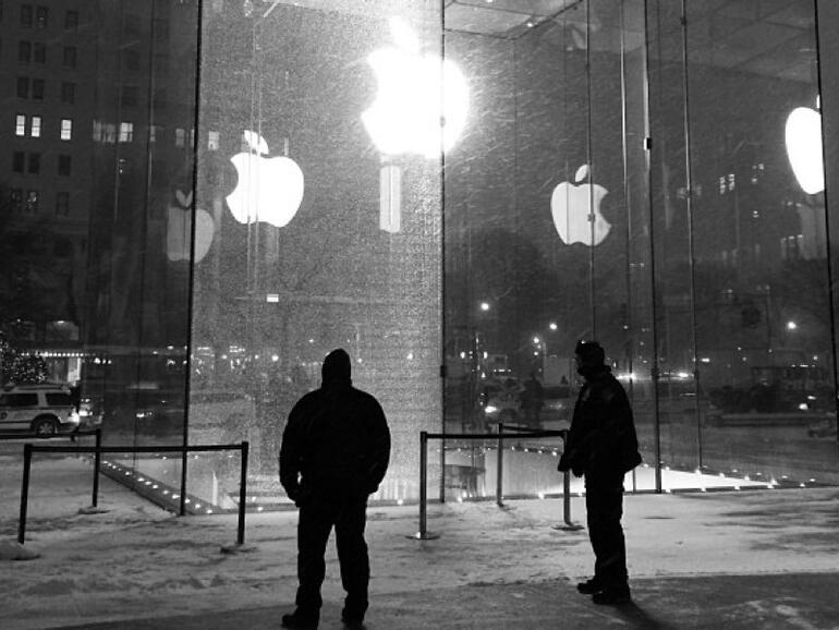 Der Apple Store an der Fifth Avenue ist berühmt für seinen 32-Fuß-hohen Glaskubus. An diesem vielfotografierten Hingucker ging eine der 15 großformatigen Glasscheiben zu Bruch, als eine Schneefräse den Kontakt suchte.