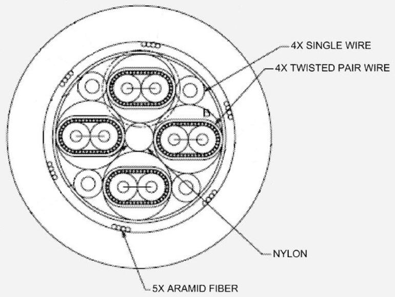 Unter den beiden Spiralen soll wiederum der Synthetikstoff Aramid das Kabel schützen und gleichzeitig das Wärmeproblem etwas bändigen. Aramid wird einerseits in der Luft- und Raumfahrt-Technik eingesetzt – Stichwort Wärme – schützt allerdings gleichzeitig in kugelsicheren Westen vor eindringenden Projektilen. Unter der Schicht sollen sich laut dem Patent wiederum vier Kabelpaare sowie vier einzelne Kabel befinden. In der Mitte des Kabels könnte entweder ein Nylondraht für zusätzliche Stabilität sorgen, oder aber ein Glasfaserkabel für zusätzliche Zwecke verbaut werden. Letzteres wäre logisch, denn Thunderbolt ist Apples Variante von Intels Light-Peak-Technologie die wiederum auf optischen Signalen basiert.